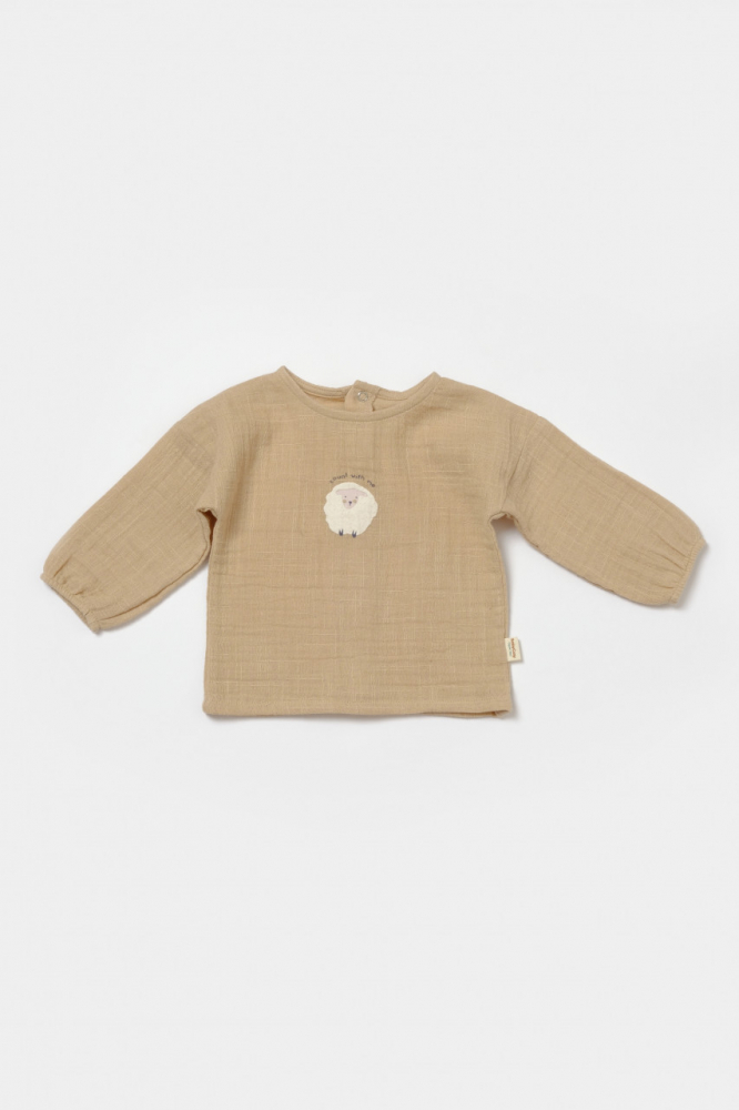 2. Bluza cu maneci lungi, din 100% bumbac - muselina, are un imprimeu haios pe piept. Aceasta se inchide cu capse la spate,