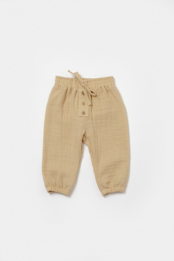 1. Pantalonasi din 100% bumbac - muselina delicat cu pielea gingasa a a bebelusului. Acestia au talia elastica si foarte confortabila. Sunt prevazuti cu 3 nasurasi decorativi