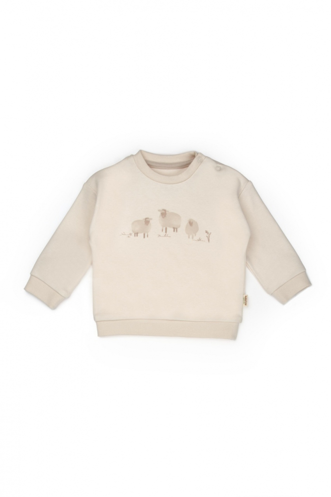 Designul delicat, în tonuri neutre, este completat de imprimeuri cu oițe, realizate cu vopseluri pe bază de apă, sigure pentru pielea sensibilă.