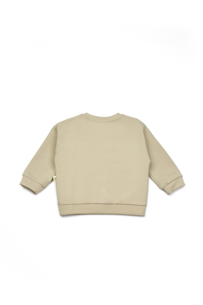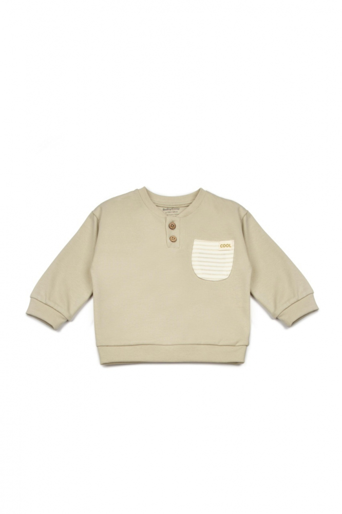 2. Bluza cu maneci lungi, din 100% bumbac are un buzunar cu mesaj la piept. Aceasta se inchide cu 2 nasturasi pentru a putea fi imbracat/dezbracat cat mai usor