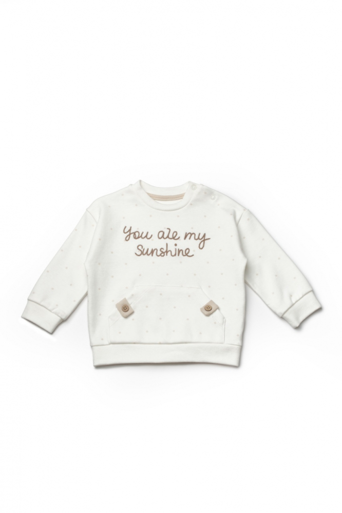2. Bluza cu maneci lungi, din 100% bumbac are un mesaj brodat pe piept. . Aceasta se inchide cu capse la umar pentru a putea fi imbracat/dezbracat cat mai usor