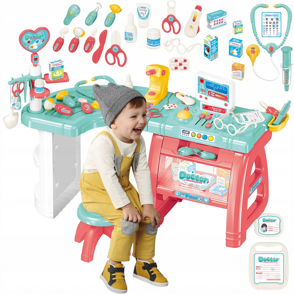 - Joc si invatare: in timp ce se joaca, copiii invata despre corpul uman, instrumente medicale si cum sa acorde primul ajutor. E ca si cum ar fi intr-un adevarat cabinet medical!