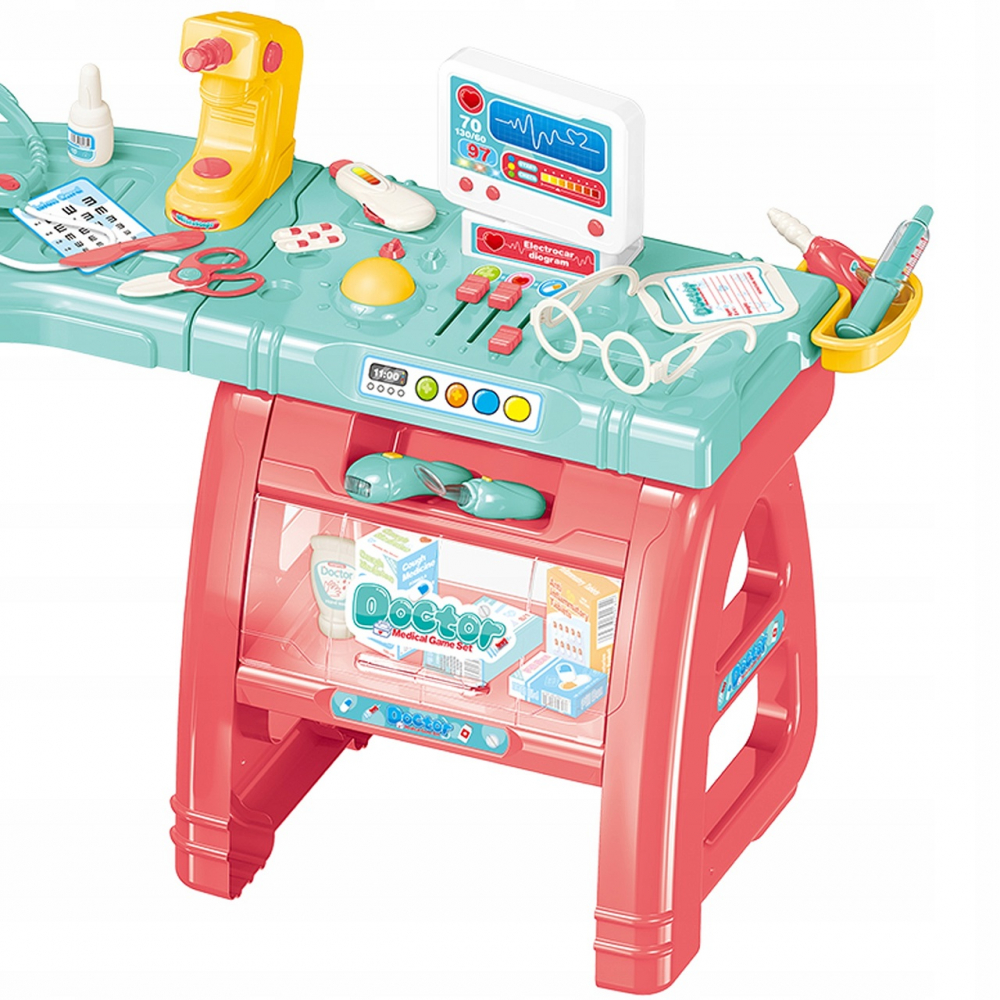 Set cabinet medical 3in1 cu birou medic, sunete, lumini si 27 accesorii Pink/Turcoaz
