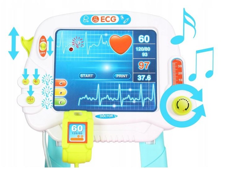 - Ecranul de monitorizare are diverse butoane de sunet, care emit sunete ca de la un dispozitiv real in timpul operatiei, de exemplu puls. LED-urile colorate si stralucitoare adauga atractivitate produsului.