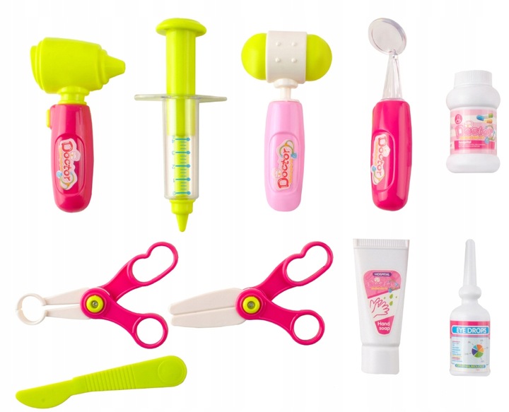 Setul este realizat in intregime din plastic, instrumentele medicale prezentate sunt imitatii ale instrumentelor medicale reale, carora li s-au dat forme prietenoase si culori vii.