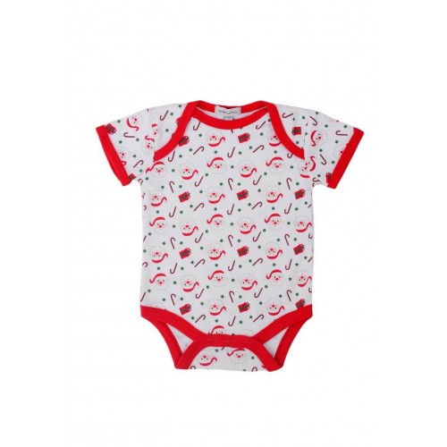 Un set simpatic pentru bebelusi, cu design de Craciun, compus din 2 piese: un body cu maneca scurta cu Mos Craciun si o bavetica asortata pe care este brodat mesajul "Santa's Cutie".