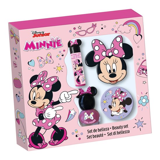 Setul de produse cosmetice pentru fetite, Minnie, contine 1 lac de unghii 4 ml 1 balsam de buze 3.5ml , 1 oglinda pentru poseta, o pila pentru unghii cu tematica Minnie, pentru cele mai cochete fetite.