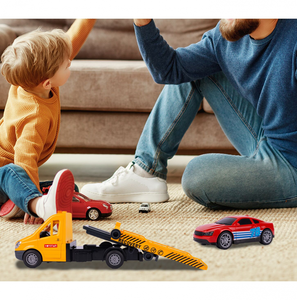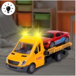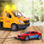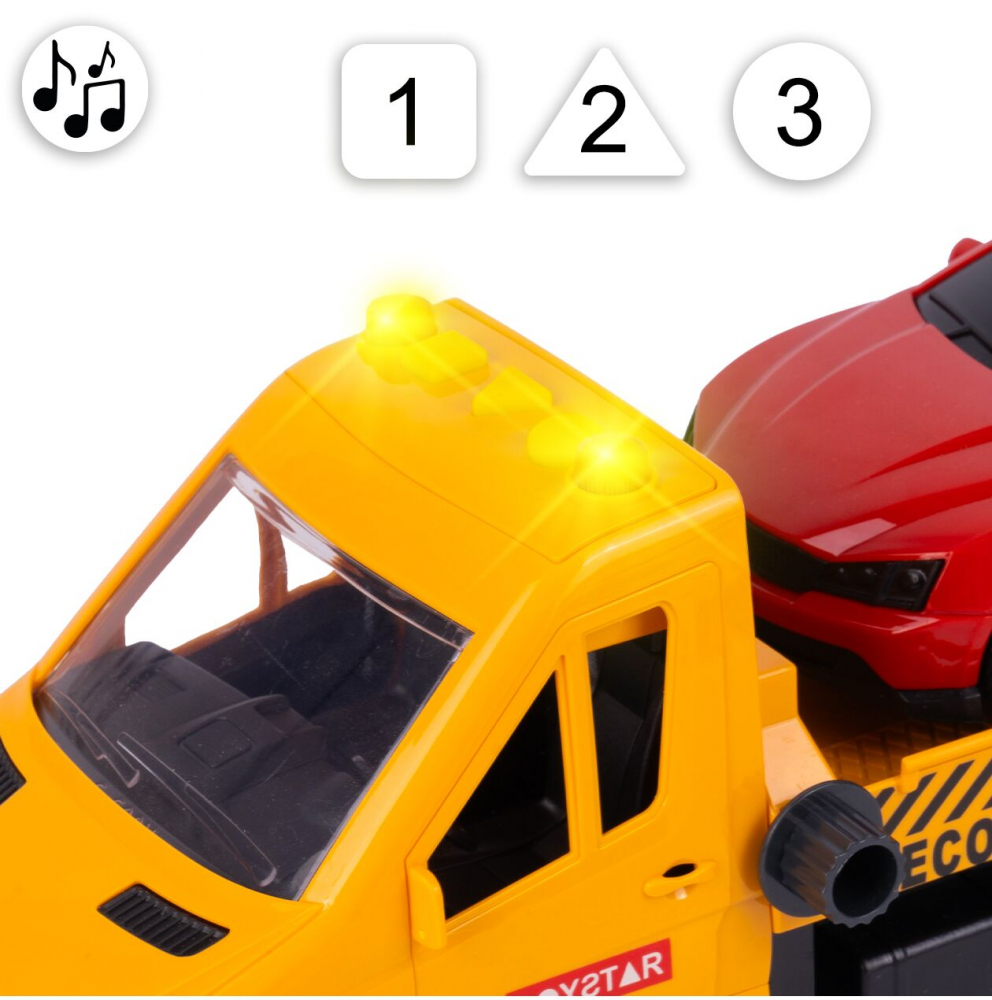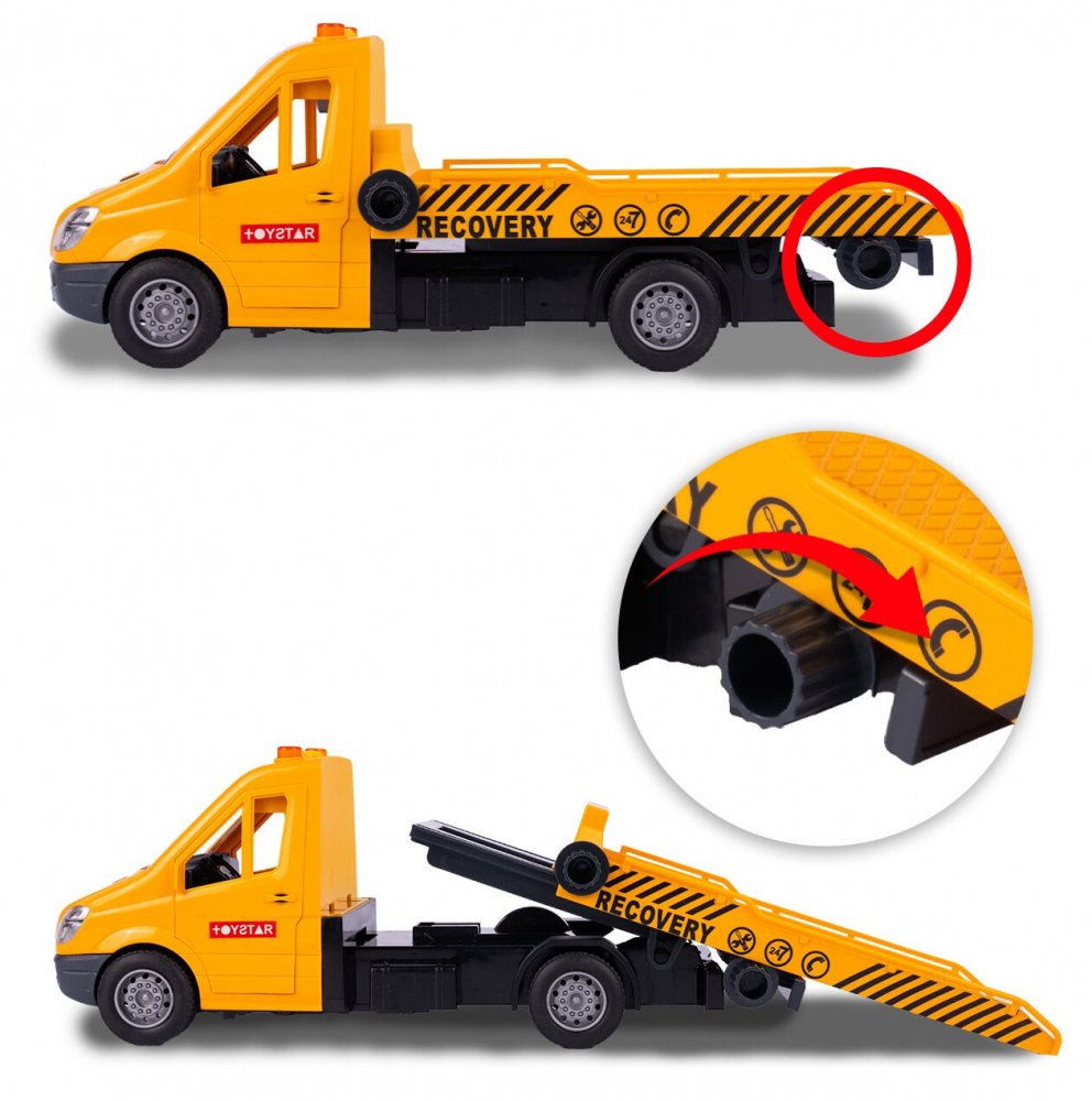 Set Camion de remorcare 28.5 cm cu efecte sonore si luminoase, cu platforma mobila pentru incarcare/descarcare, si mainuta sport inclusa 16.5cm, Recovery Transporter