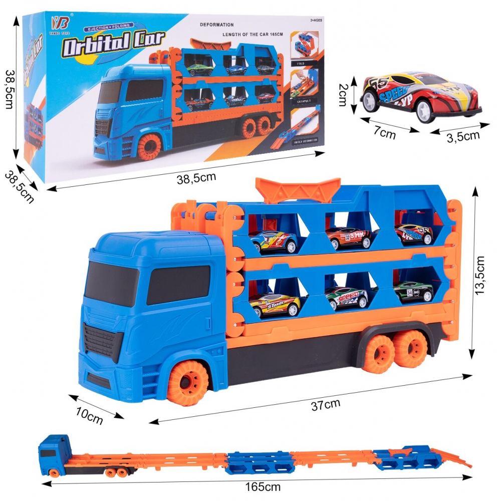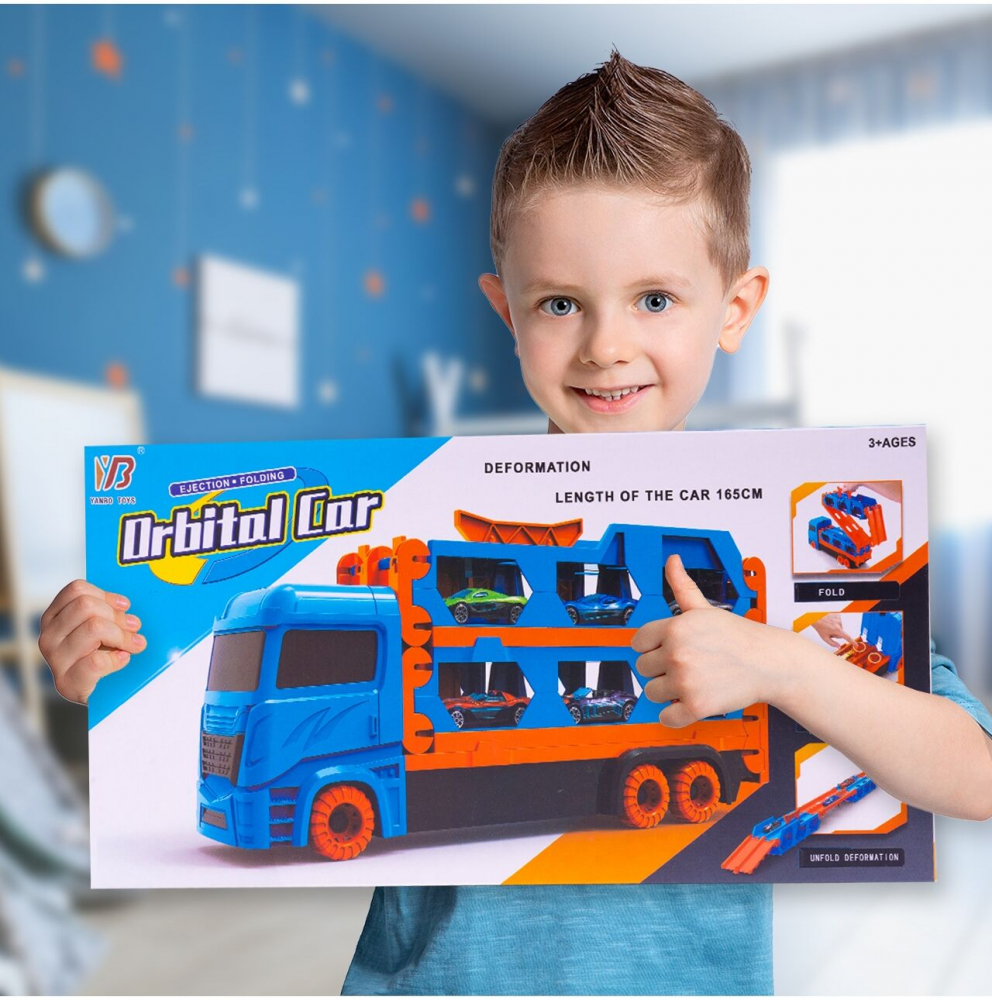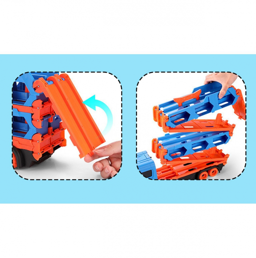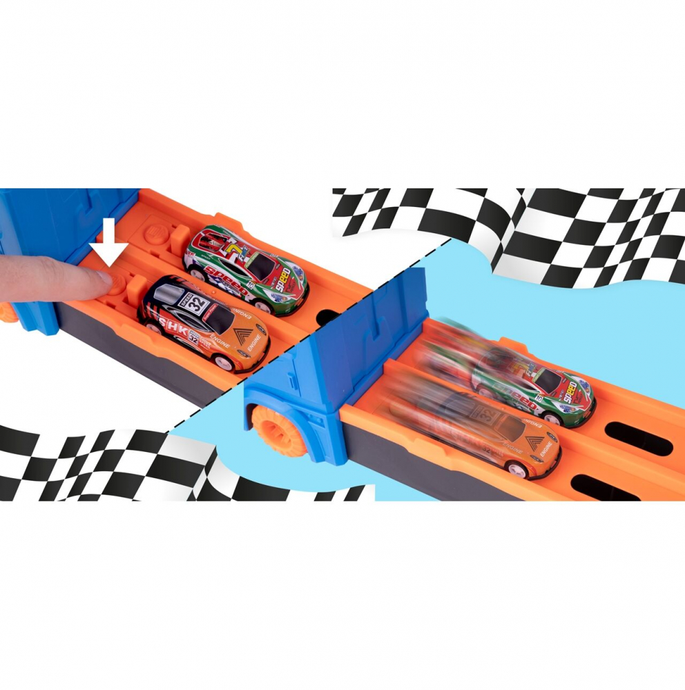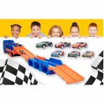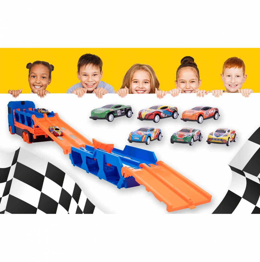 Te-ai plictisit de pistele obisnuite de jucarie? Ai nevoie de adrenalina si chiar de mai multa distractie? Atunci aceasta pista de curse extraordinara este propunerea perfecta pentru tine! Un camion plin de surprize, care se transforma intr-un lansator de senile, redefineste distractia masinilor de jucarie.