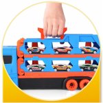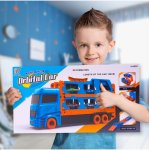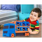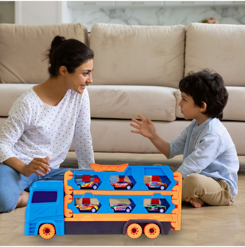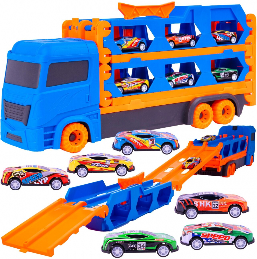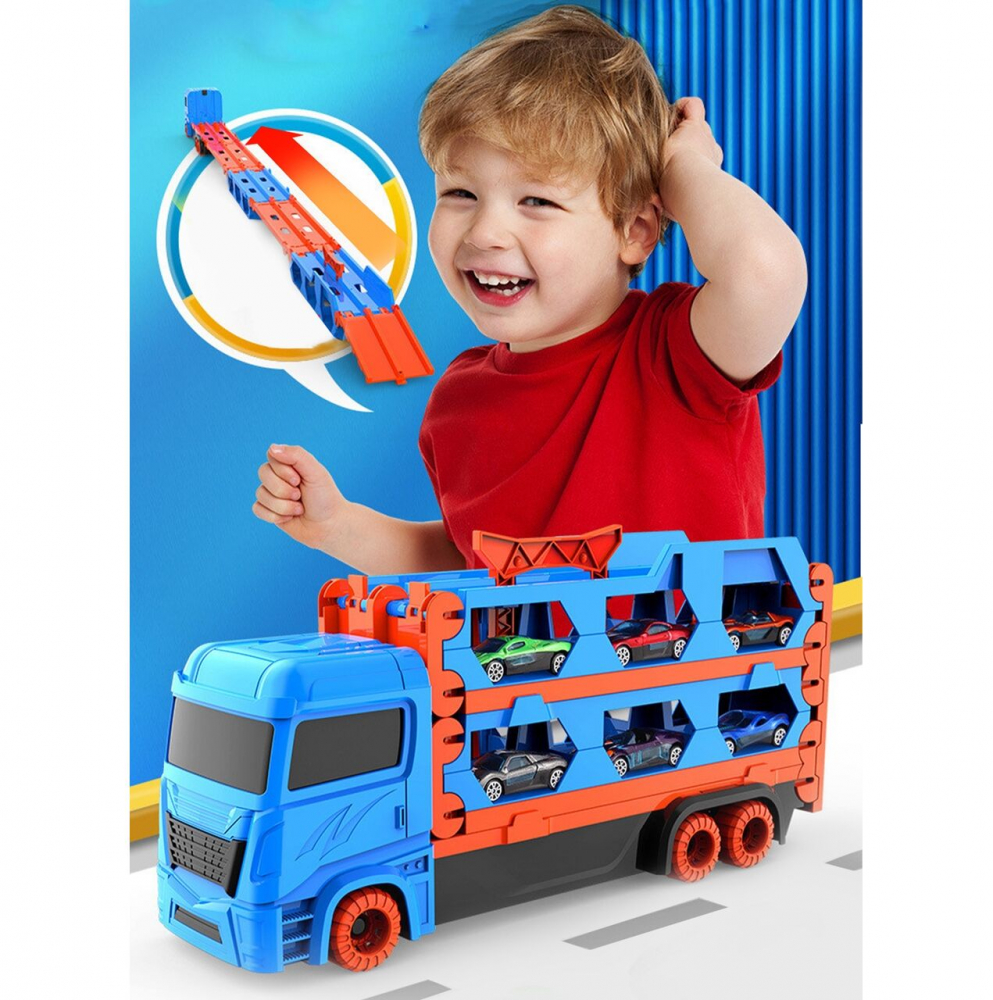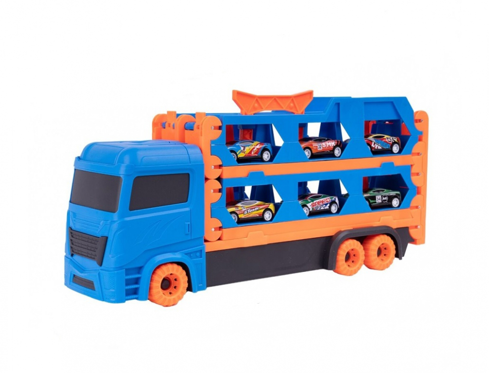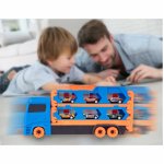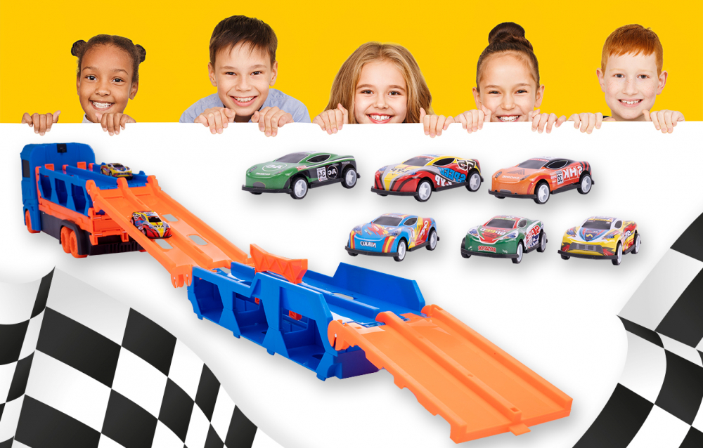 Te-ai plictisit de pistele obisnuite de jucarie? Ai nevoie de adrenalina si chiar de mai multa distractie? Atunci aceasta pista de curse extraordinara este propunerea perfecta pentru tine! Un camion plin de surprize, care se transforma intr-un lansator de senile, redefineste distractia masinilor de jucarie.