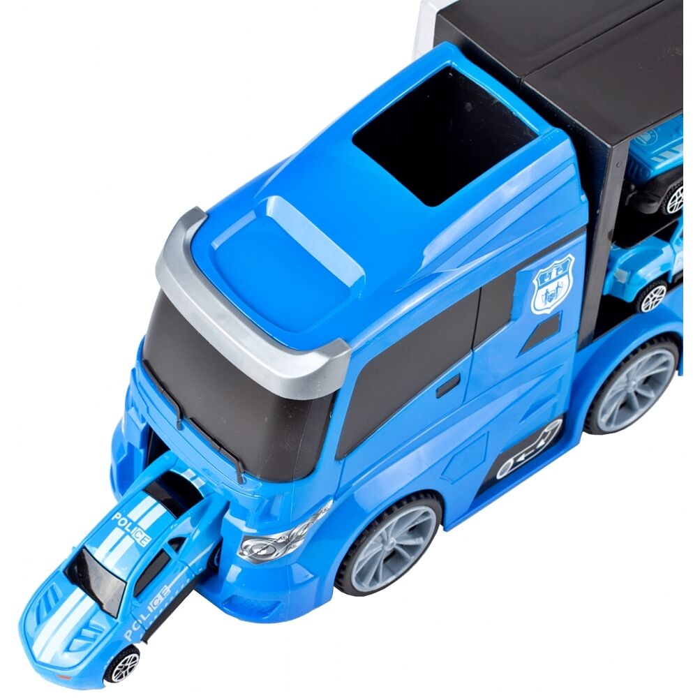 * Camionul nu este doar o jucarie grozava in sine, ci serveste si ca depozit pentru vehiculele mai mici. In acest set de politie, copilul poate alege dintre 4 masini diferite, un autobuz si chiar un elicopter.