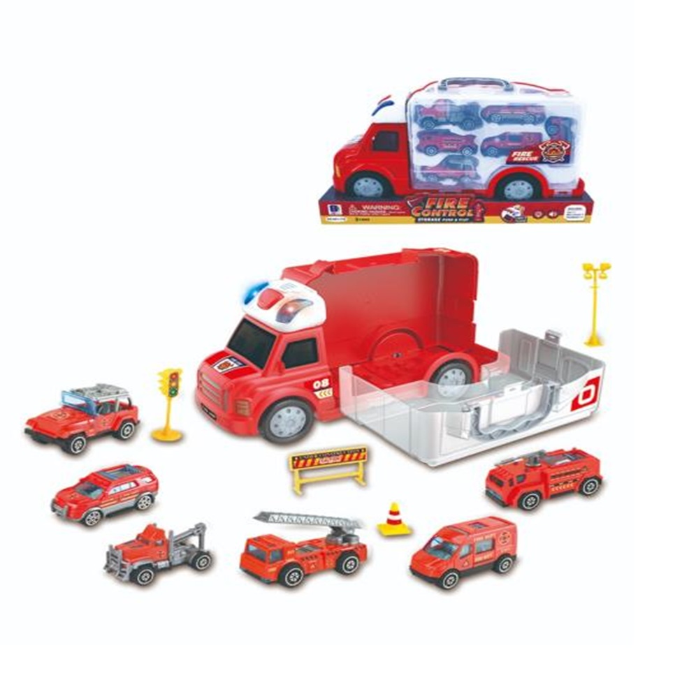 Piesa centrala este un impresionant camion de transport pompieri , de un rosu vibrant, echipat cu lumini de avertizare functionale.