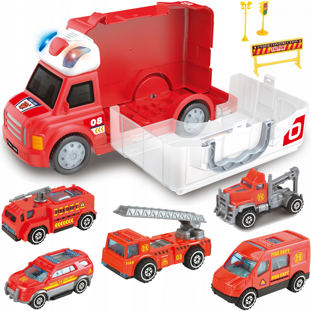 Set camion de remorcare Matadi Fire Truck, tip valiza cu maner, prevazut cu lumini si sunete, include o flota de 6 masinute de pompieri si accesorii rutiere