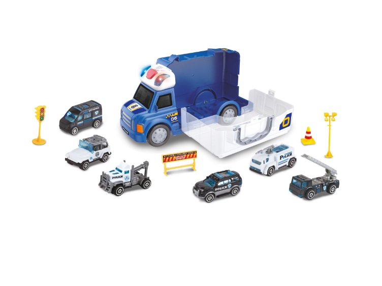 Setul include o flota de sase masini de politie detaliate, gata de actiune: de la SUV-uri robuste pentru patrulare urbana si off-road, la un camion de remorcare si o masina de interventie cu scara, fiecare cu design-uri autentice.