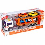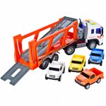 Set Camion transportator de remorcare, dimensiune 9 x 38 x 16 cm, emite sunete si lunimi specifice, cu 4 masinute incluse