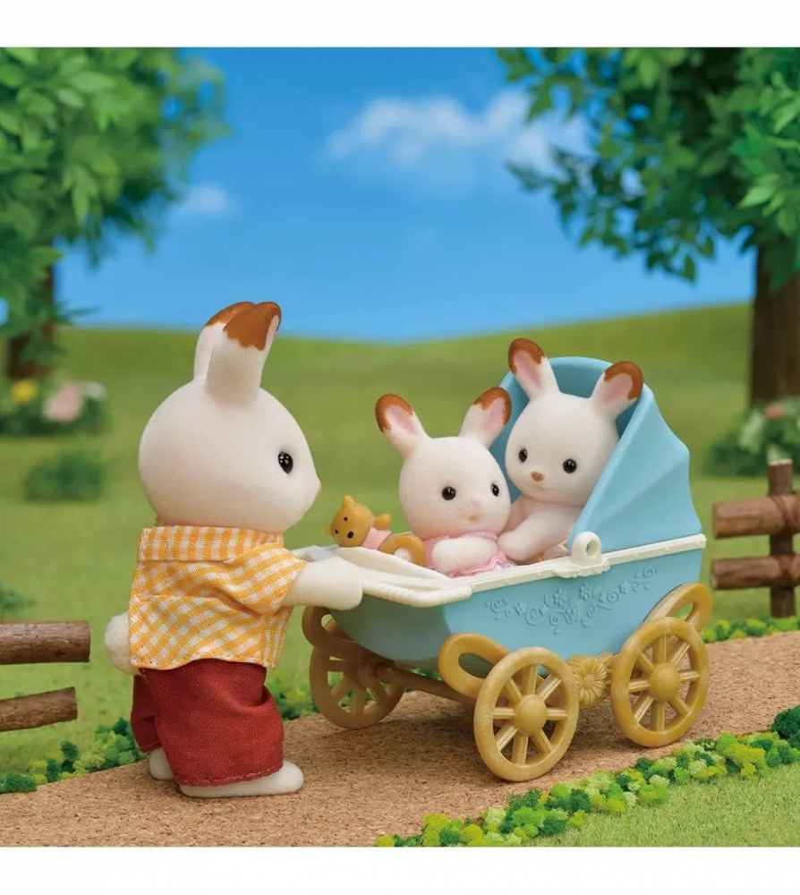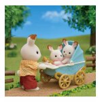 Sylvanian Families-Set Carucior Iepurasi Gemeni este format din cele doua figurine: Gemenii Kabe si Breeze Chocolate Rabbit; 1 carucior albastru cu roti mobile; 2 jucarii.