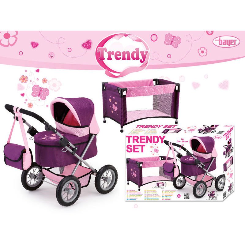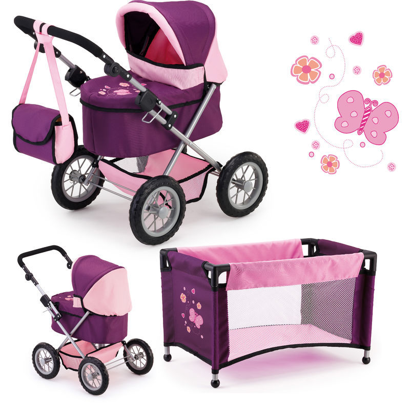 Set carucior pliabil si patut papusi Bayer Trendy Charlene Plum,cadru metalic,maner reglabil pana la 68cm,gentuta de umar/ husa picioare si lenjerie incluse,roti rezistente
