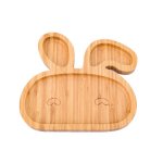 Set-ul de vesela din bambus contine un bol din bambus cu diametru de 12 cm si volum de 300 ml o farfurie din bambus in forma de iepuras, ambele cu baza aderenta tip ventuza din silicon si o lingurita cu maner din bambus si varf de silicon.