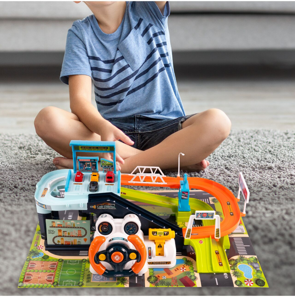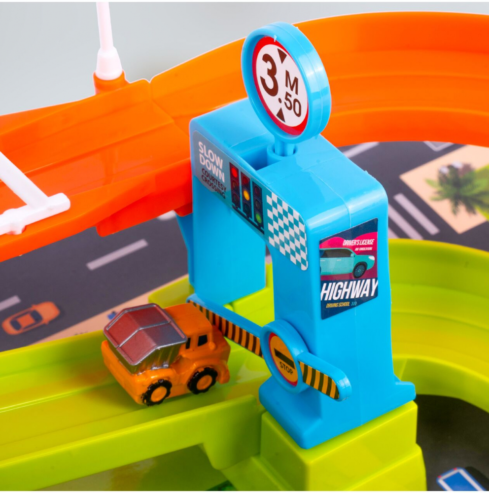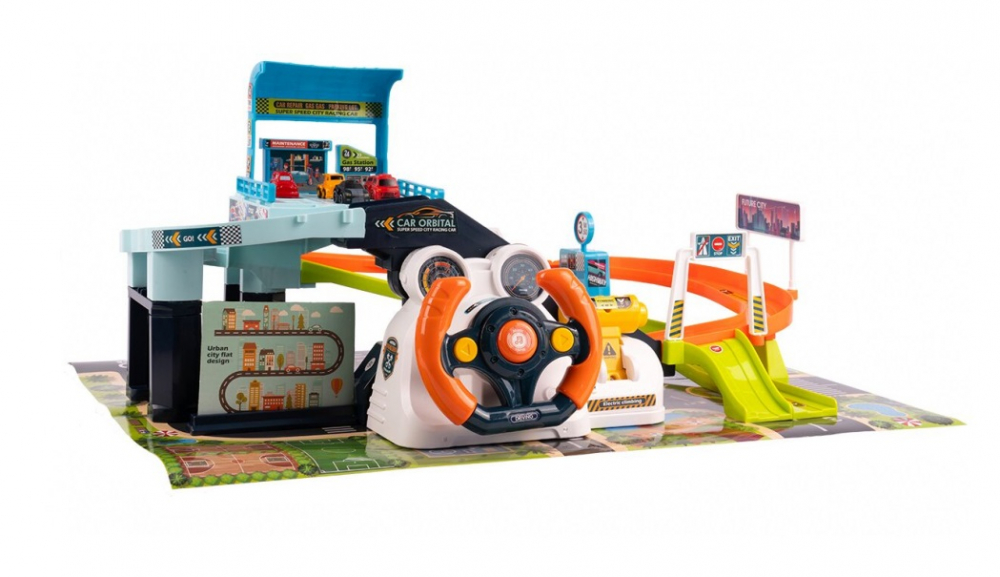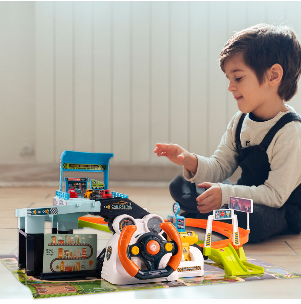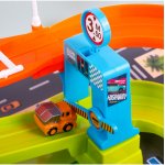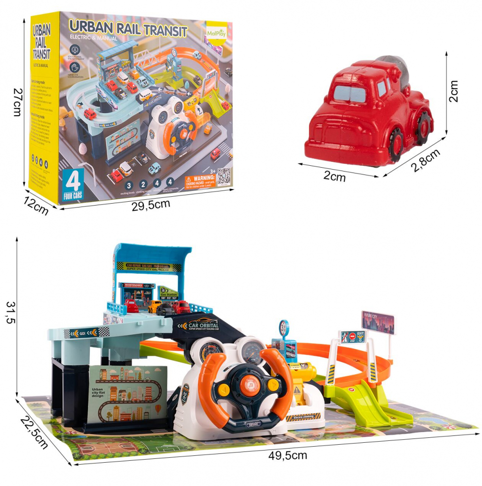 Set circuit interactiv pentru copii Malplay, cu obstacole, volan cu claxon, schimbator de viteze, parcare supraetajata si 4 masinute incluse, dimensiune 49.5 x 31.5 x 22.5 cm, Urban rail