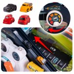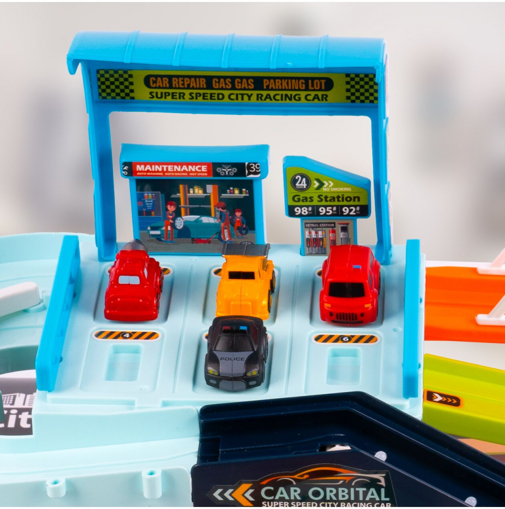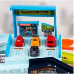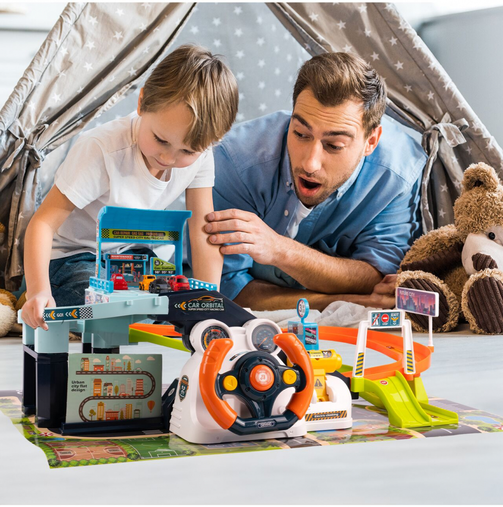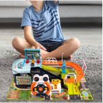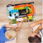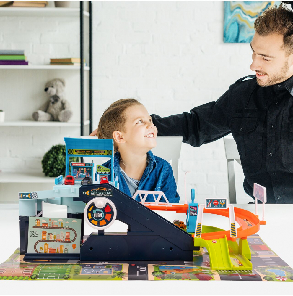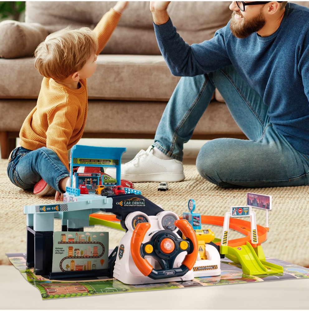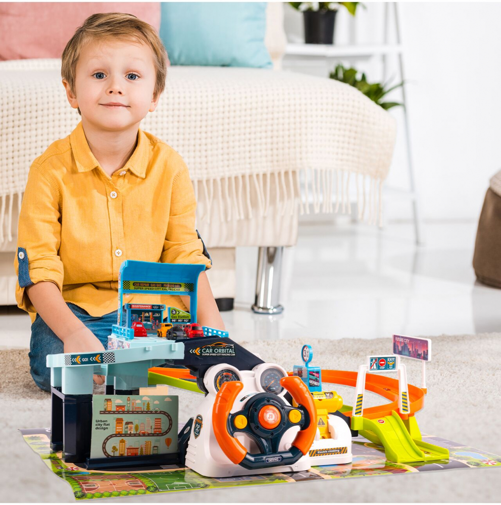 Set circuit interactiv pentru copii Malplay, cu obstacole, volan cu claxon, schimbator de viteze, parcare supraetajata si 4 masinute incluse, dimensiune 49.5 x 31.5 x 22.5 cm, Urban rail