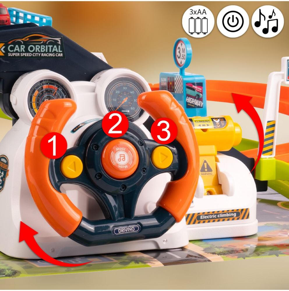 - Volanul alimentat cu baterii (3 x 1.5V AA) are un buton de claxon, semnalizatoare si melodii vesele pentru o experienta suplimentara.