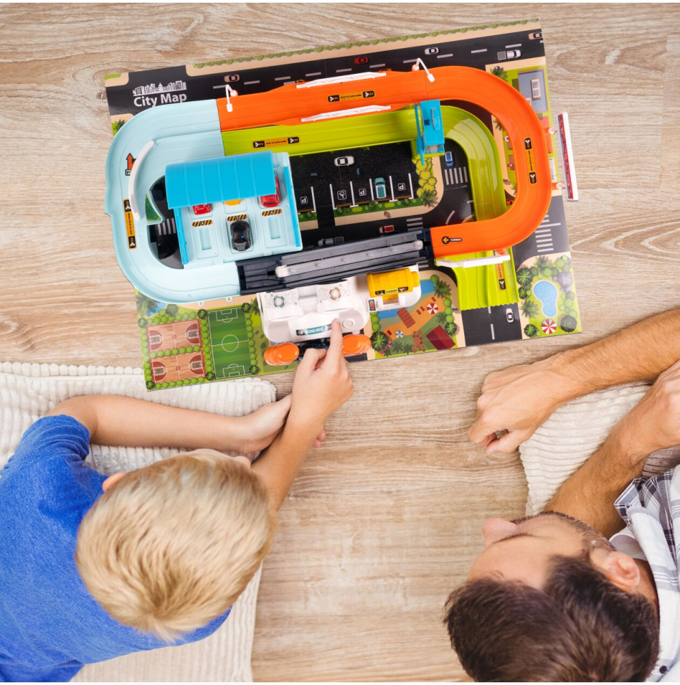 * Toate vehiculele nu au margini ascutite, ceea ce le face ideale pentru copiii mici. In plus, setul include un covoras cu o harta imprimata a orasului, ceea ce creste si mai mult posibilitatile de joc.