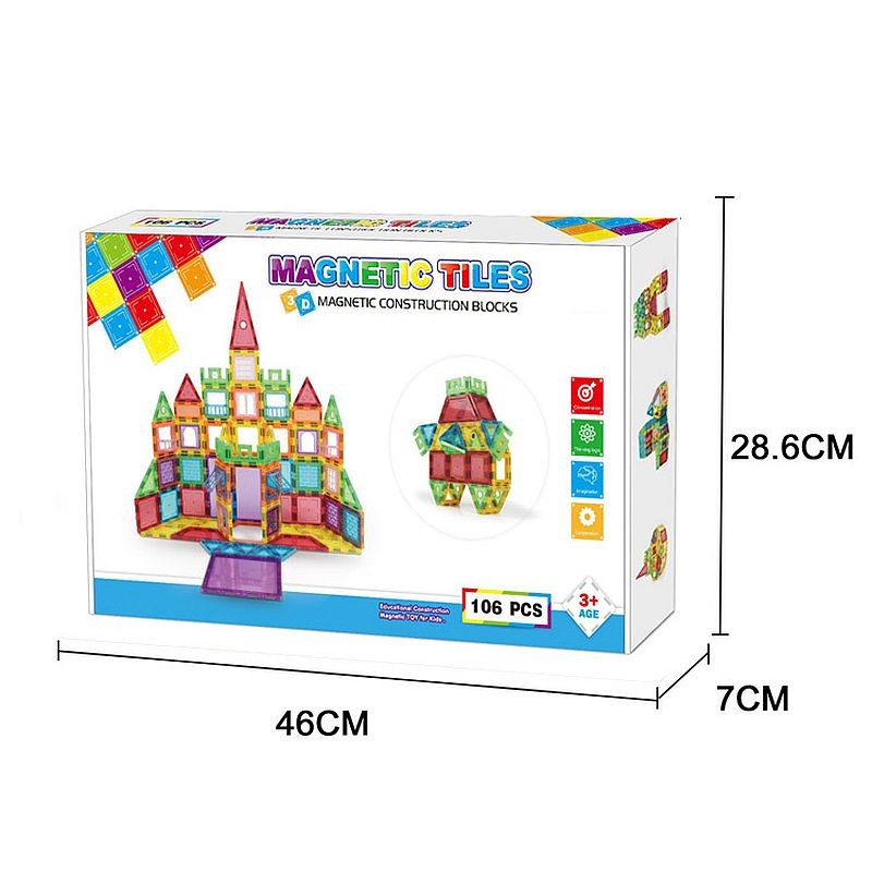 Acest set este unul extrem de creativ, un joc educativ de constuctie a unui castel magnetic format din 106 piese colorate, usor de folosit. Blocurile magnetice permit copiilor constructia unor forme noi in fiecare zi, bazate pe creativitatea si viziunea fiecaruia. Datorita magnetului de pe margine, odata formate, blocurile isi vor pastra forma pana la urmatoarea creatie. Setul acesta este un cadou perfect pentru orice copil, fiind un joc care cultiva simtul artistic, dezvolta creativitatea si imaginatia. Timpul petrecut construind diverse forme tridimensionale ajuta copilul sa isi imbunatateasca atentia, rabdarea, nivelul de concentrare, capacitatea de proiectare, gandirea logica si cea critica.