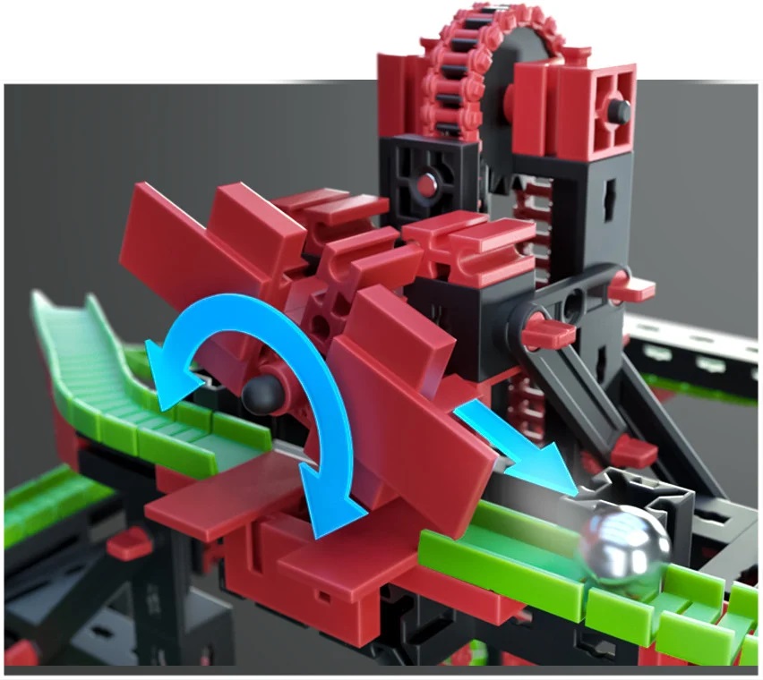 După ce au trecut prin bucle și alte obstacole, bilele se vor întoarce la punctul de așteptare al liftului, de unde vor fi aduse înapoi sus cu ajutorul liftului acționat de un mic motor.