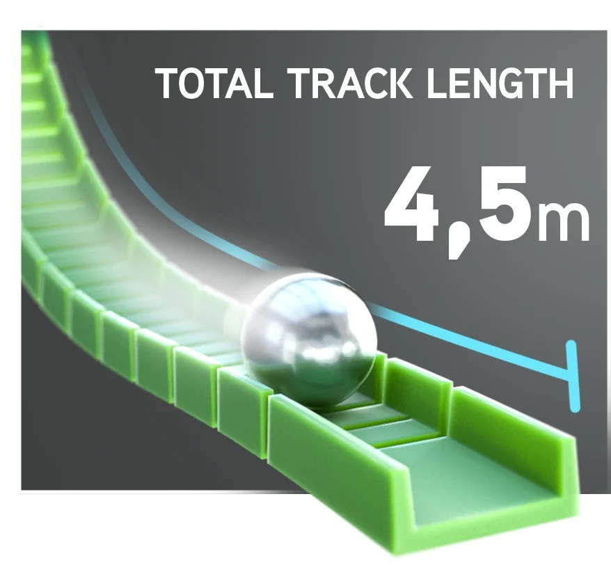 Cele patru șine flexibile, cu margine laterală ridicată, permit bilelor să se rostogolească la viteză maximă prin curbe și să zboare peste intersecții, către pâlnia rotativă.