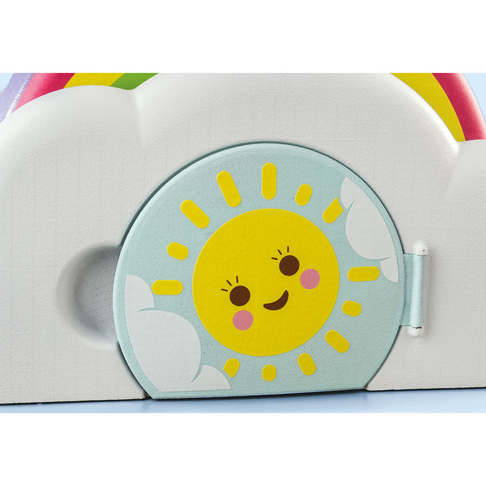 Accesorii: 1 casuta cu nori cu usa de soare, 1 curcubeu cu functie de zornait, 4 blocuri de constructie curcubeu pentru a stivui si a face puzzle, 5 piese de puzzle cu picaturi de ploaie, 2 avioane de visare.