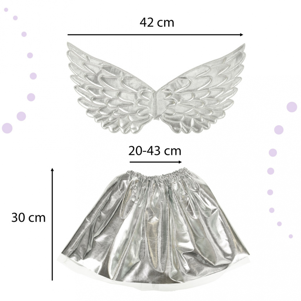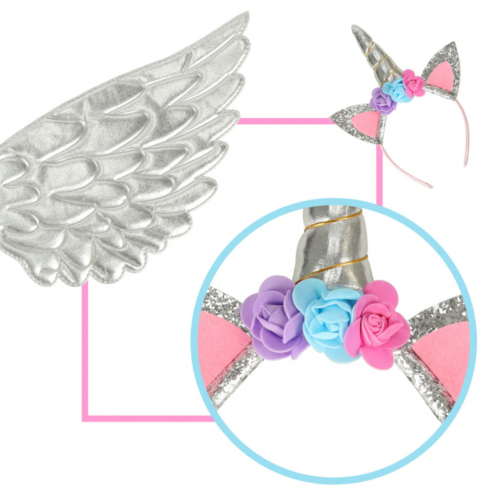 Costumul include o bentita cu urechi de unicorn, aripi si o fustita, oferind copiilor o transformare completa intr-un unicorn fermecator.