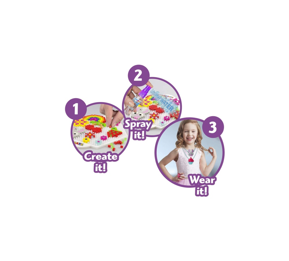 Setul ofera 2 sabloane de design, margele in 17 culori diferite, 1 placa, 1 colier si 2 inele, 1 spray de apa si un manual.
