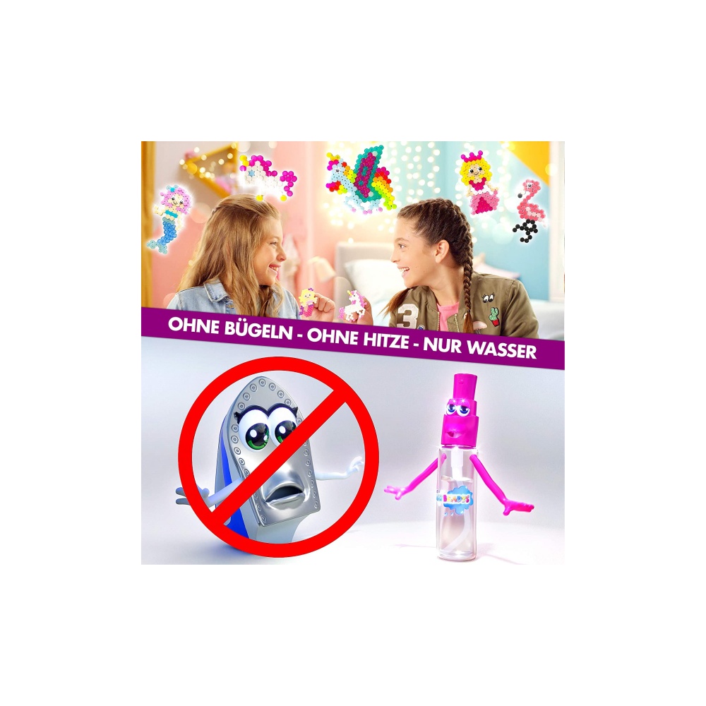 Set Creatii Margele functioneaza fara caldura: aranjati pur si simplu margelele pe sablon dupa cum doriti, umeziti-le cu apa, lasati-le sa se usuce si indepartati designul finit de pe placa.