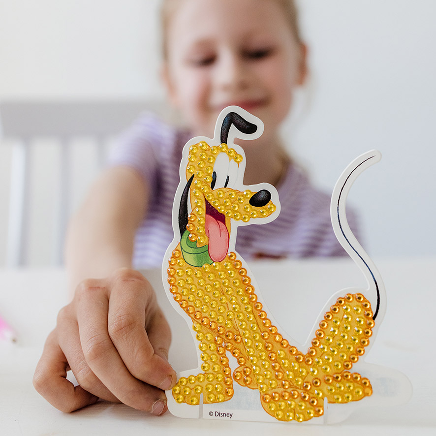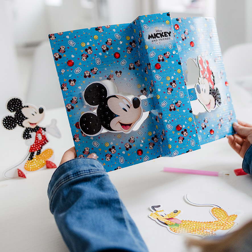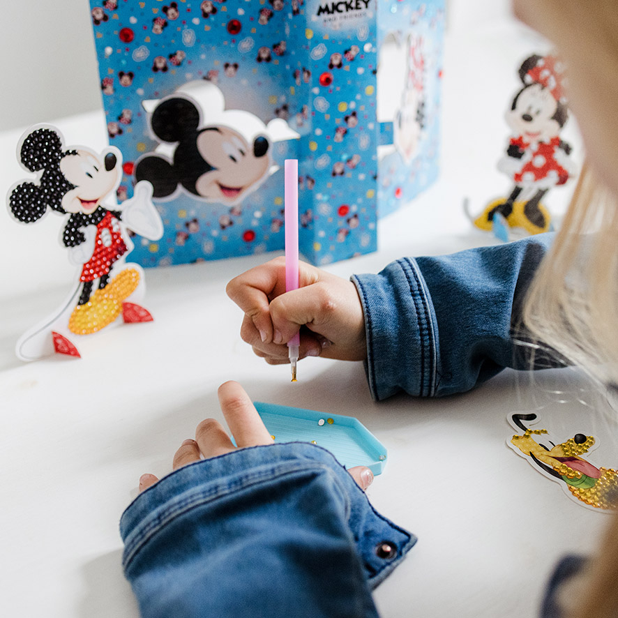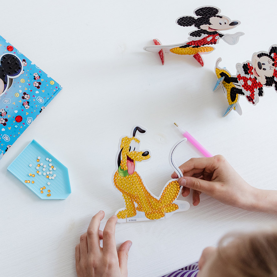 Iti poti crea 2 bratari cu pandantive Minnie si Mickey sau poti decora figurinele Minnie, Mickey si Pluto cu tehnica "diamond painting".