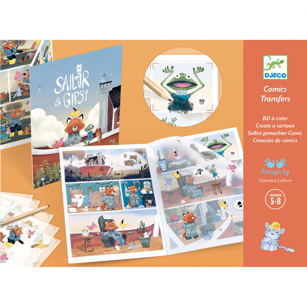 Acest set îi invită pe copii să creeze o bandă desenată cu personaje amuzante folosind planșele de transfer: imaginile se răzuiesc ușor cu creionul și se transferă pe planșa fundal preilustrată. Pas cu pas, copiii poziționează