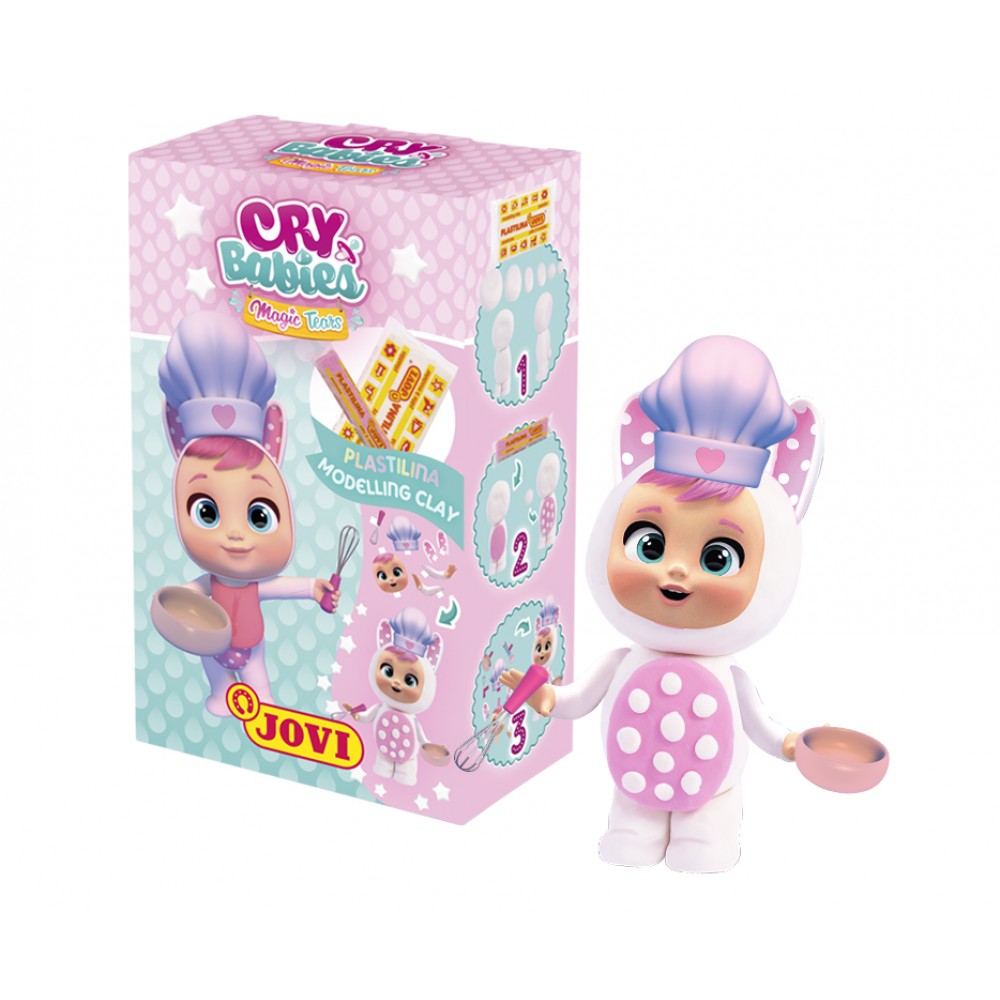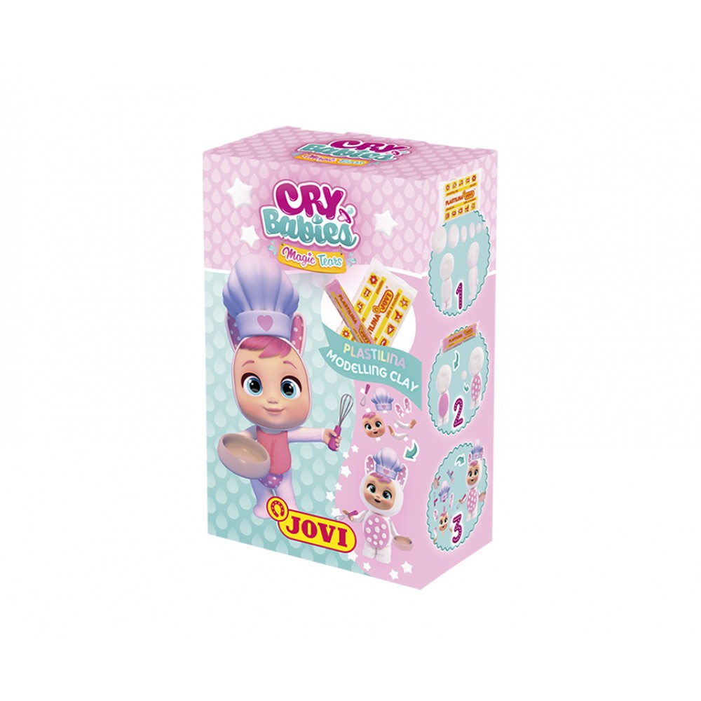 Set creativ Cry Babies cu plastilina Jovi, Coney contine componentele pretaiate ale unei papusi Cry Babies, un baton de plastilina vegetala de 50g si unul de 15 g.