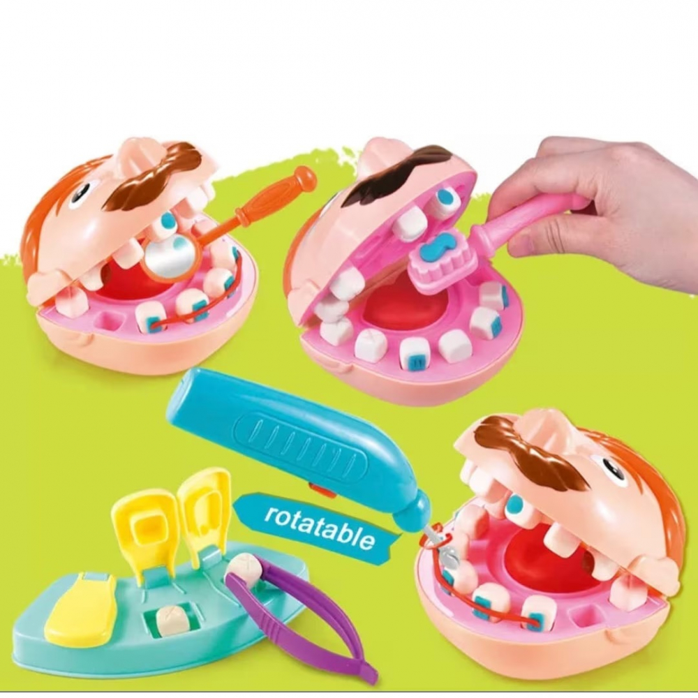 Setul contine: cap pacient ,o matrita pentru crearea dintilor din masa de plastic ,dalta ,burghiu ,bretele, oglinda, perie joaca ,aluat .