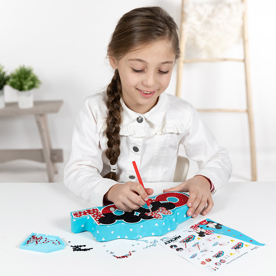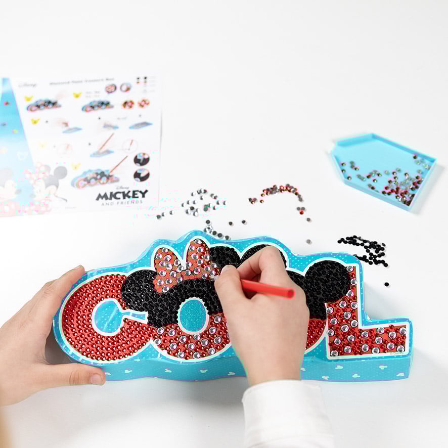 Cu acest set creativ iti poti personaliza propriul cufar pentru comori, obiecte speciale, bijuterii, cu ajutorul tehnicii "daimond paint", cu tema Mickey si prietenii.