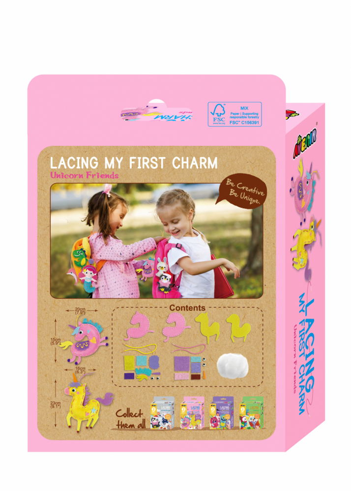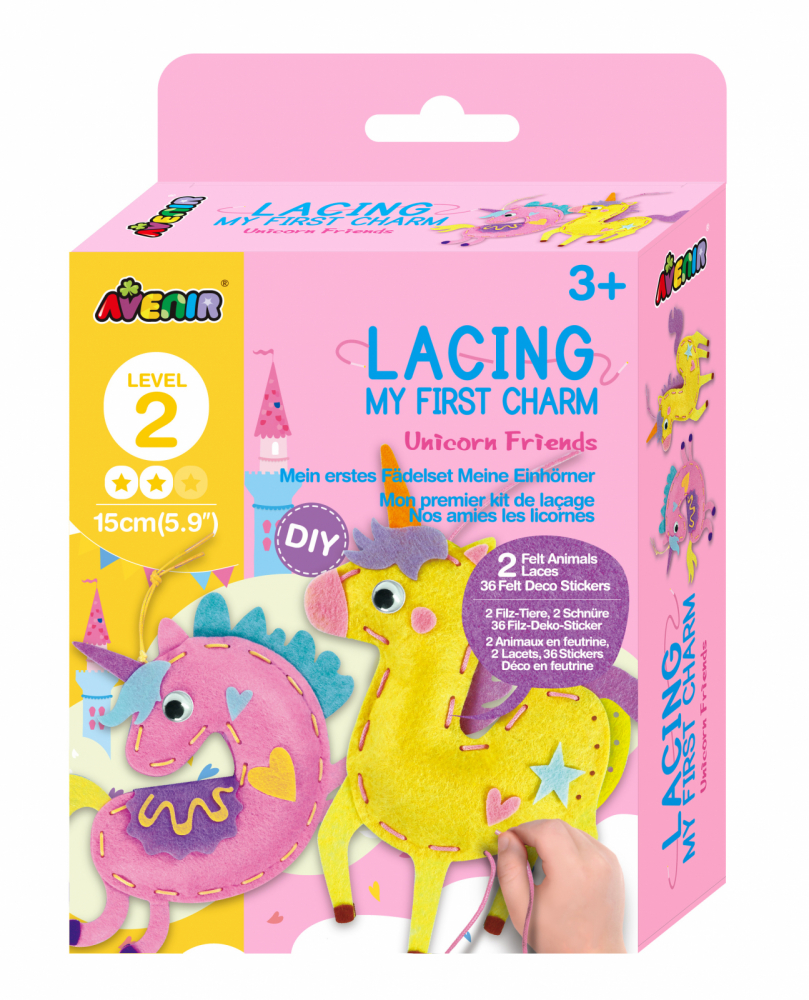 Conceput pentru mâini mai mici, cu fir gros de siret și găuri mari, Lacing My First Charm Unicorn Friends conține 2 personaje unicorn distractive și ușor de făcut, cu care să creați și să vă jucați.
