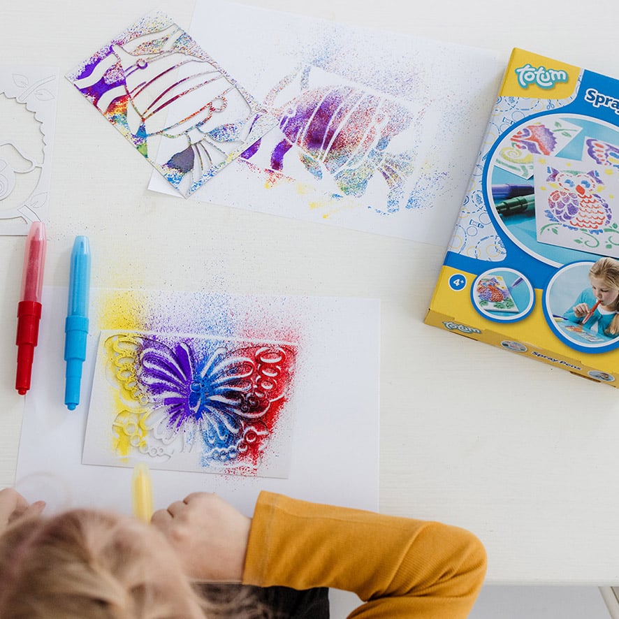 Contine 5 carioci cu spray in culori diferite (rosu, mov, galben, verde si albastru) si 4 sabloane cu tematica animala pentru a realiza desene colorate cu „efect aerograf”.