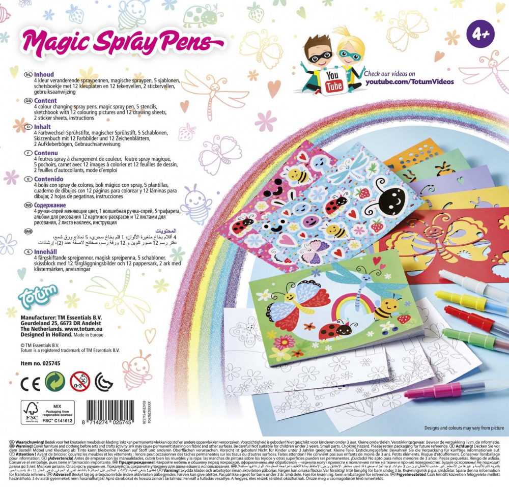 Include: 4 pixuri puverizatoare care isi schimba culoarea, 1 pix magic pentru schimbarea culorii, 5 sabloane, carnetel cu 12 file de desen si 12 de colorat ( 24 de file), 2 foi cu abtibilduri, instructiuni.