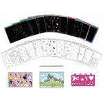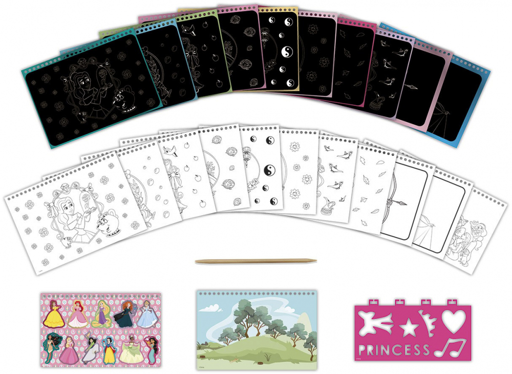 Setul include: 10 planse cu sclipici de razuit, instrumentul de razuit, 11 planse de colorat, un sablon, o folie de abtibilduri si un decor.