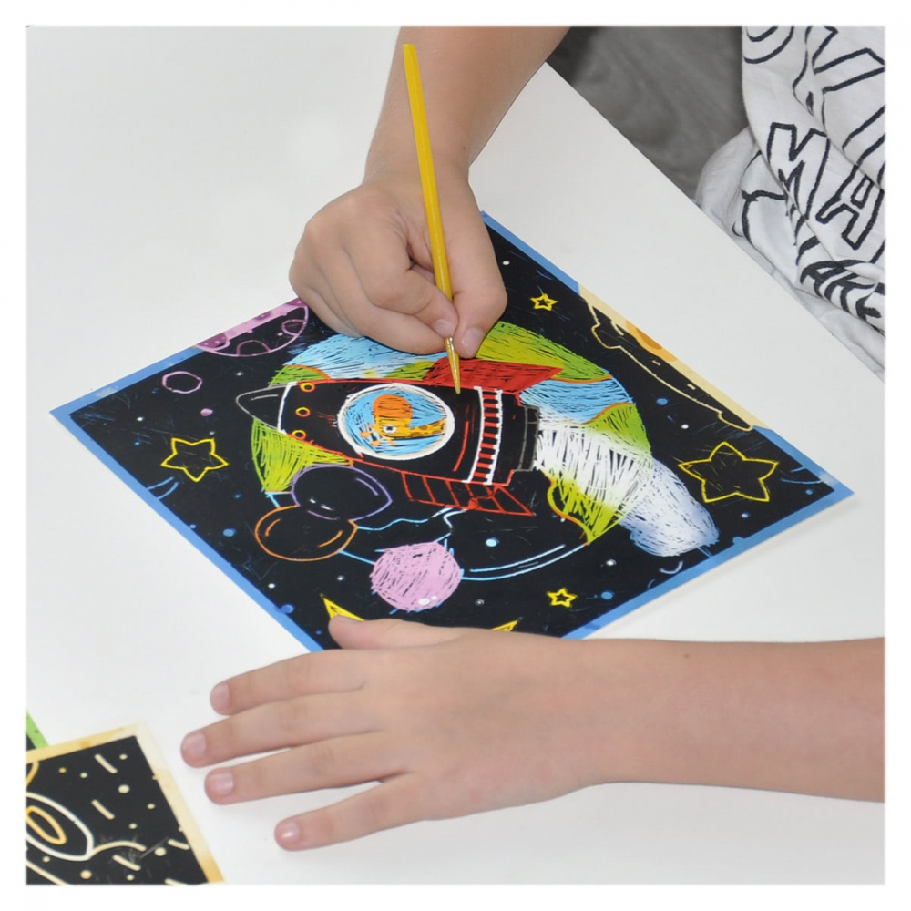 • Incurajeaza creativitatea micutului tau cu acest set de gravura razuibil avand ca tematica Spatiul Cosmic, de la Dodo Toys!