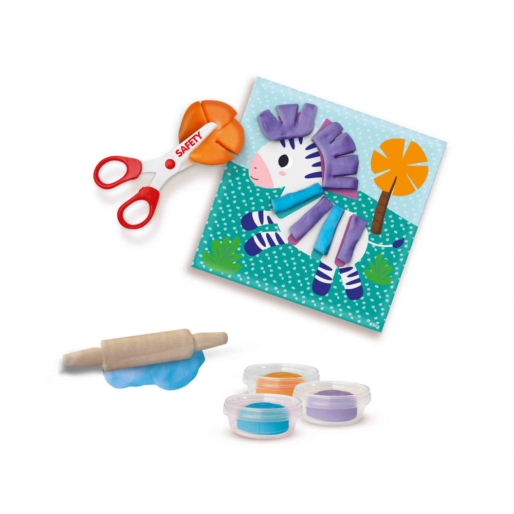 Pe langa cartonasele reutilizabile si cele 3 culori de plastilina, setul contine asadar si foarfece sigure pentru copii.