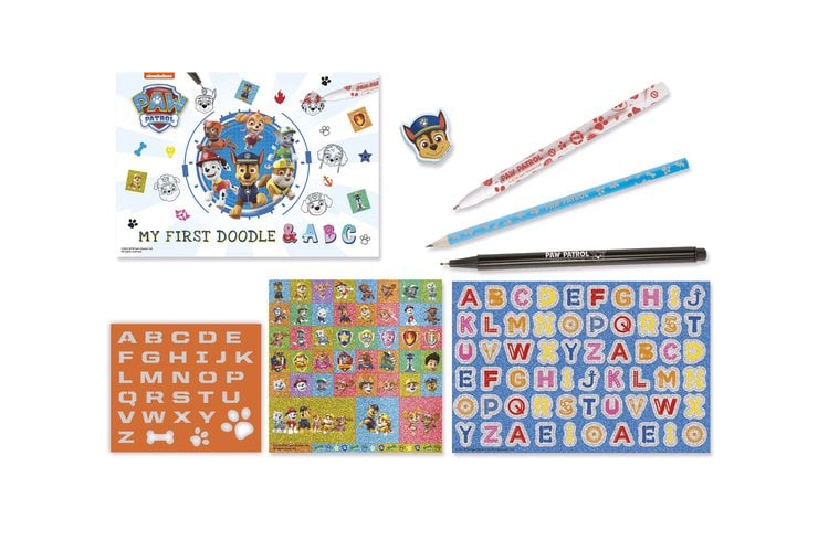 Setul include: radieră Chase, stilou cu sclipici rosu, fineliner, creion, abtibilduri Paw Patrol și litere, sablon ABC și caiet de desen.