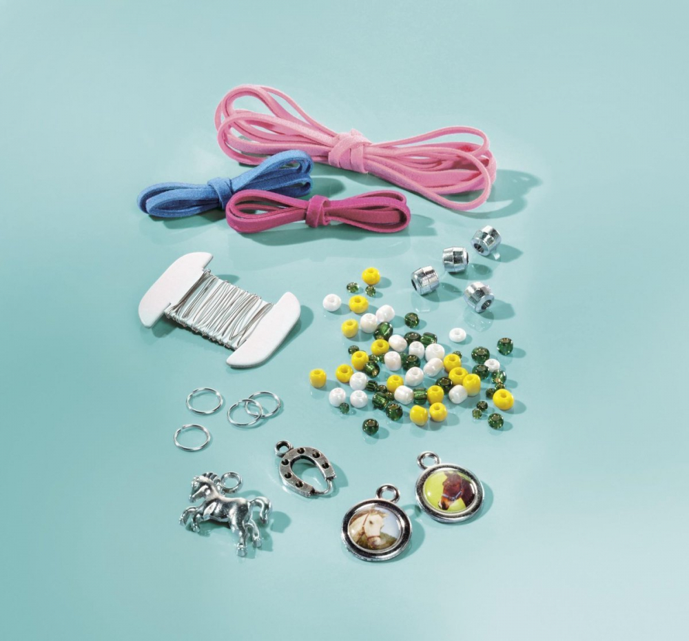 Setul include: snur, amuleta calut, potcoava, 2 amulete rotunde calut, fir metalic, margele, inele metalice, instructiuni.