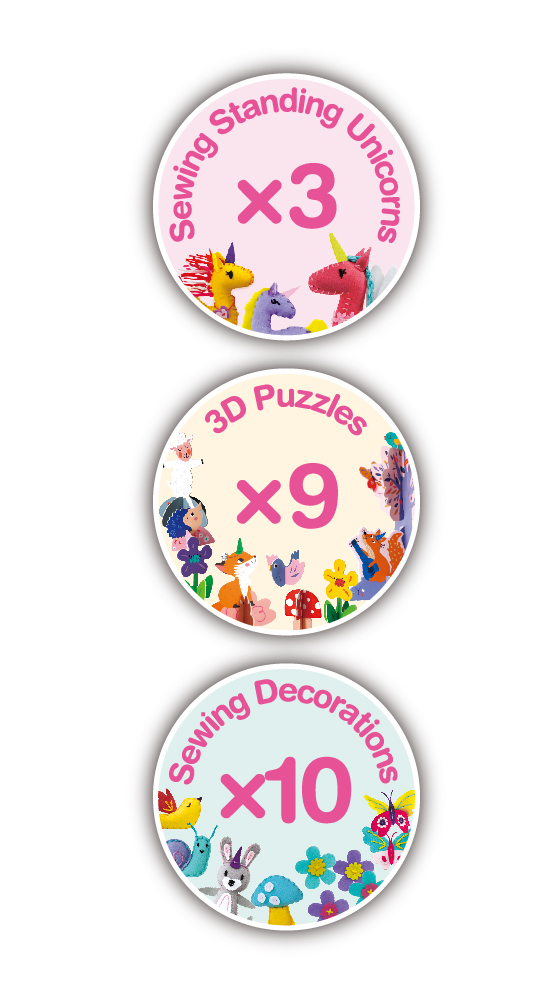 Combină activitățile de cusut cu materiale textile și carton de calitate pentru a crea 3 unicorni în picioare și alte 17 animale în picioare și decorațiuni, cum ar fi flori și copaci.