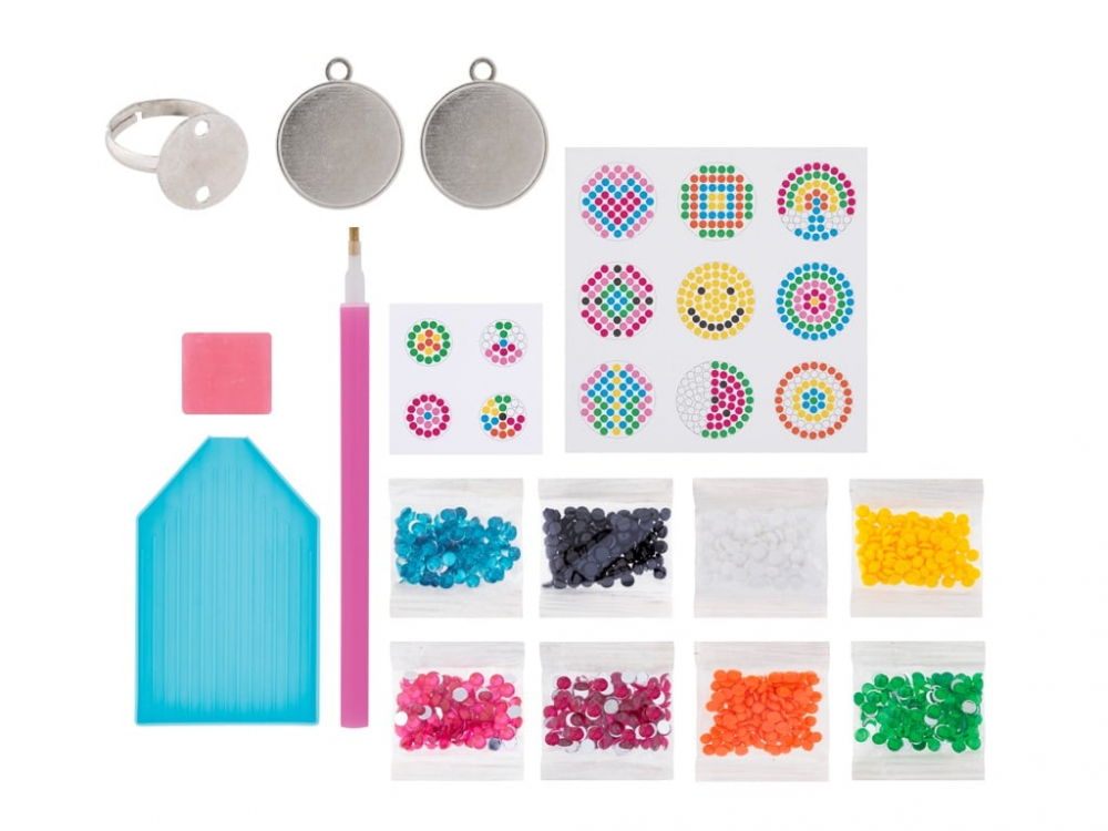 • 2 x lanturi pentru pandantive, 1 x tava de sortare, 2 x pandantive cu za, 1 x stilou pentru aplicarea diamantelor, 8 x pungute cu pietricele in diferite culori, 1 x foaie sabloane pentru colier, 1 x foaie sabloane pentru inel, 1 x ceara, 1 x inel.