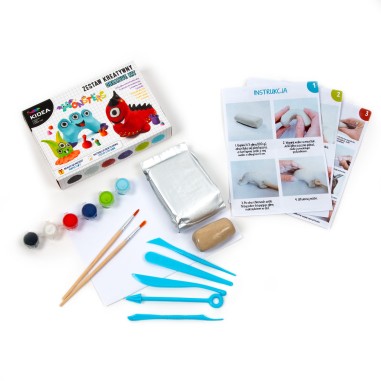 Pachetul contine 300 g de argila autointarita, 6 culori de vopsea, 5 instrumente de sculptura, doua pensule de dimensiuni diferite si instructiuni pas cu pas.