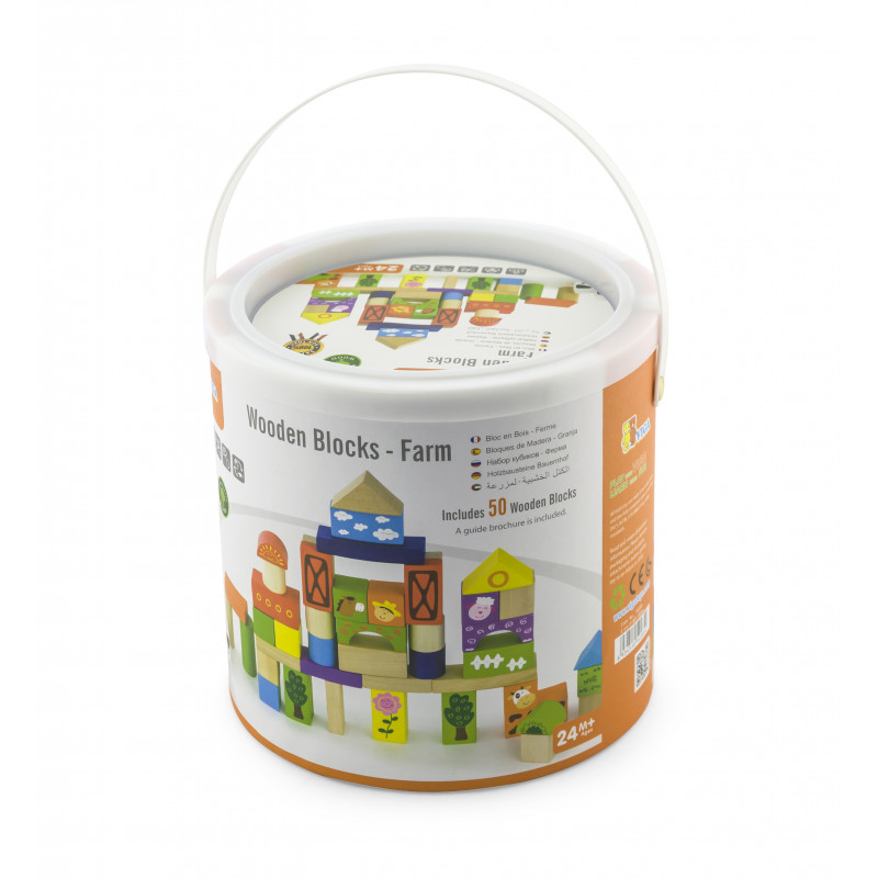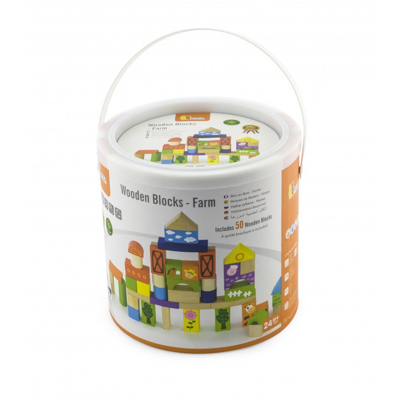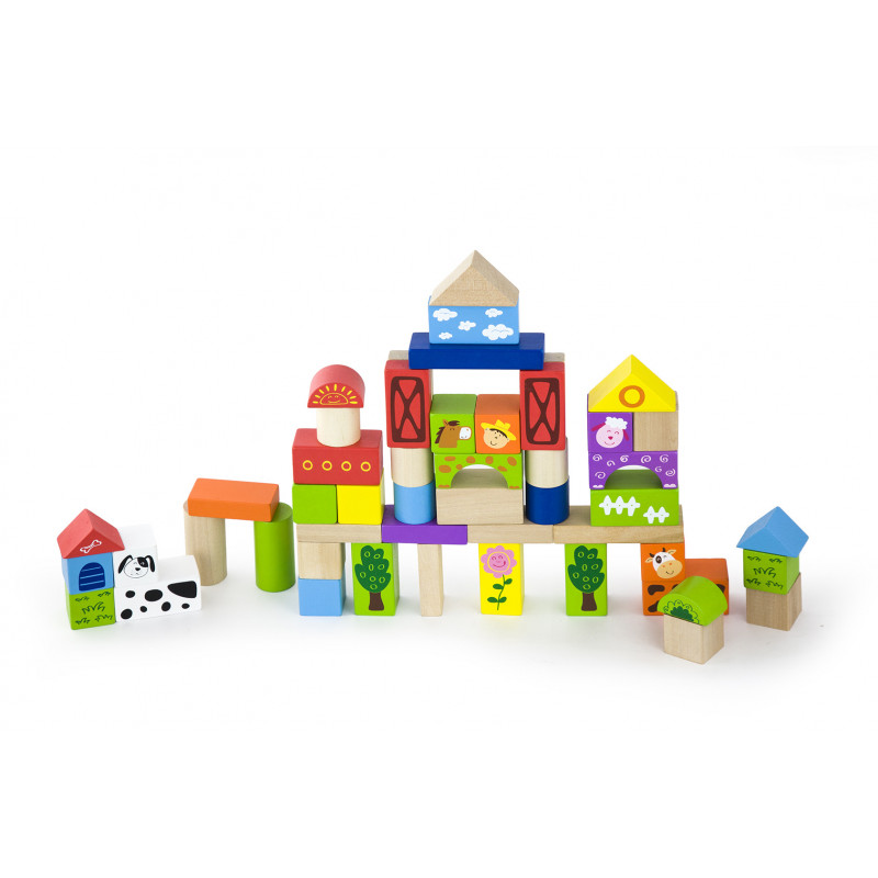 Setul de blocuri de constructie din lemn include 50 de cuburi de cate 3 cm, in diferite culori si forme.